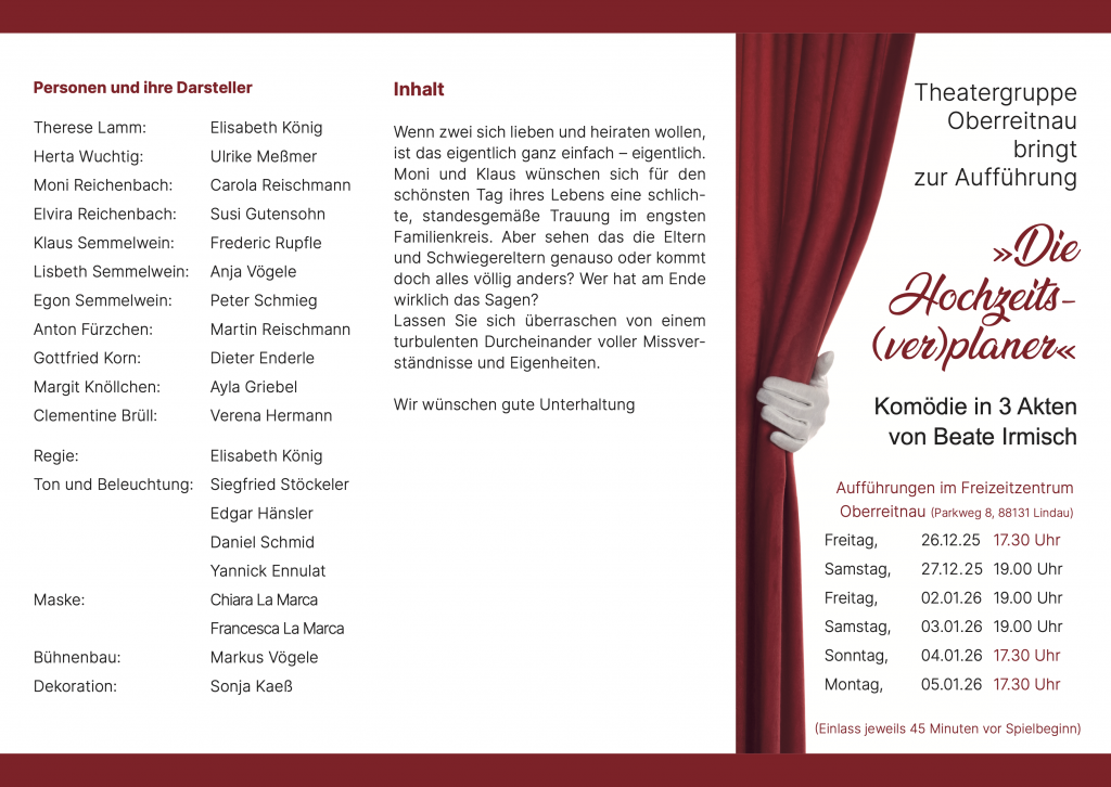 In diesem Jahr spielen wir für Sie die Komödie „Die Hochzeits(ver)planer!“ von Beate Irmisch.